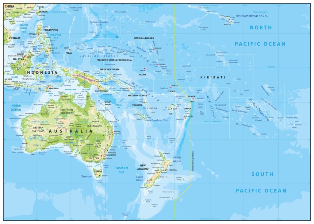 Constitué par l’Australie et la Nouvelle-Zélande, la Mélanésie, la Micronésie et la Polynésie, le continent océanien est situé dans l’océan Pacifique Sud. Outre l’Australie et la Nouvelle-Zélande, l’Océanie représente un ensemble composite de plusieurs milliers d’îles, pour la plupart de petite taille, dispersées au sud de l’équateur, à l’exception d’une partie de la Micronésie et des îles Hawaii (Etats-Unis).